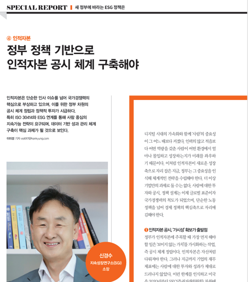 때문에 인적자본 공시를 더 이상 기업의 선택으로 두어서는 안 된다. 국가가 앞장서 제도화하고 확산해야 한다. 투명한 정보 공개, 지속가능한 성장 경로, 성과에 따른 지원이 그 핵심 원칙이다. 사람에 대한 투자가 수치로 드러날 때, 국가 경쟁력은 비로소 힘을 얻는다. 이제는 “미래는 인적자본 공시에서 시작된다”고 선언할 때가 왔다.