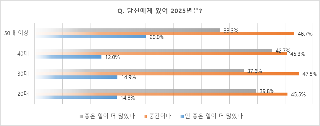 2025년을 어떻게 느꼈는지에 대한 응답은 세대별로 뚜렷한 차이를 보여주었다. 전반적으로 모든 세대에서 “중간이다”라는 응답이 가장 큰 비중을 차지했지만, 세대별로 이 비중이 차등적으로 나타나면서 각 연령대의 삶의 위치와 상황이 반영된 것으로 해석된다.