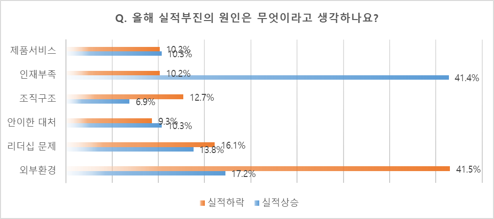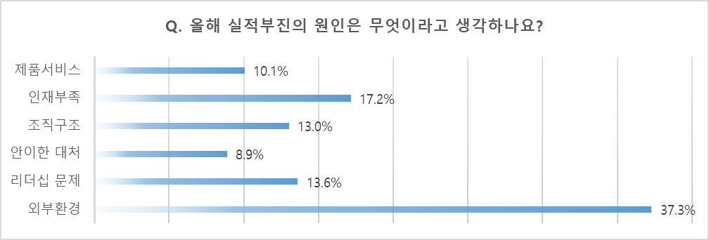 올해 실적이 생각보다 부진한 이유에 대해 현재 실적에 관계없이 모두에게 물었다. 그랬더니 1위 외부환경 37.3%, 2위 인재부족 17.2%, 3위 리더십 문제 13.6%의 순으로 나왔다.
