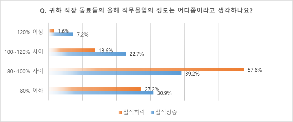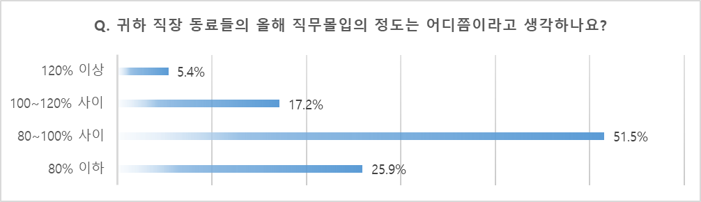 직장 동료들의 직무몰입의 정도에 대해 물었다. 직무몰입의 정도가 80%이하라는 답변이 25.9%, 80~100%사이가 51.5%, 100~120%사이가 17.2%, 120%이상이라는 답변이 5.4%로 나왔다.