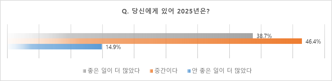 당신에게 있어서 2025년 올해는 어떤 해이었는지에 대해 물었다. 좋은 일이 더 많았다 38.7%, 중간이다 46.4%, 안 좋은 일이 더 많았다 14.9%로 나왔다.